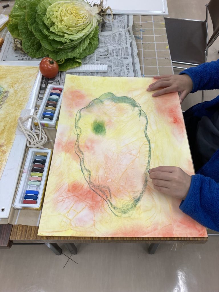根っこが付いた白菜はあまりみかけないですが、生命力や迫力を感じながら観察しました。葉っぱの広がりもおもしろく、色を塗り重ねながら色々な色で塗ってくれました。